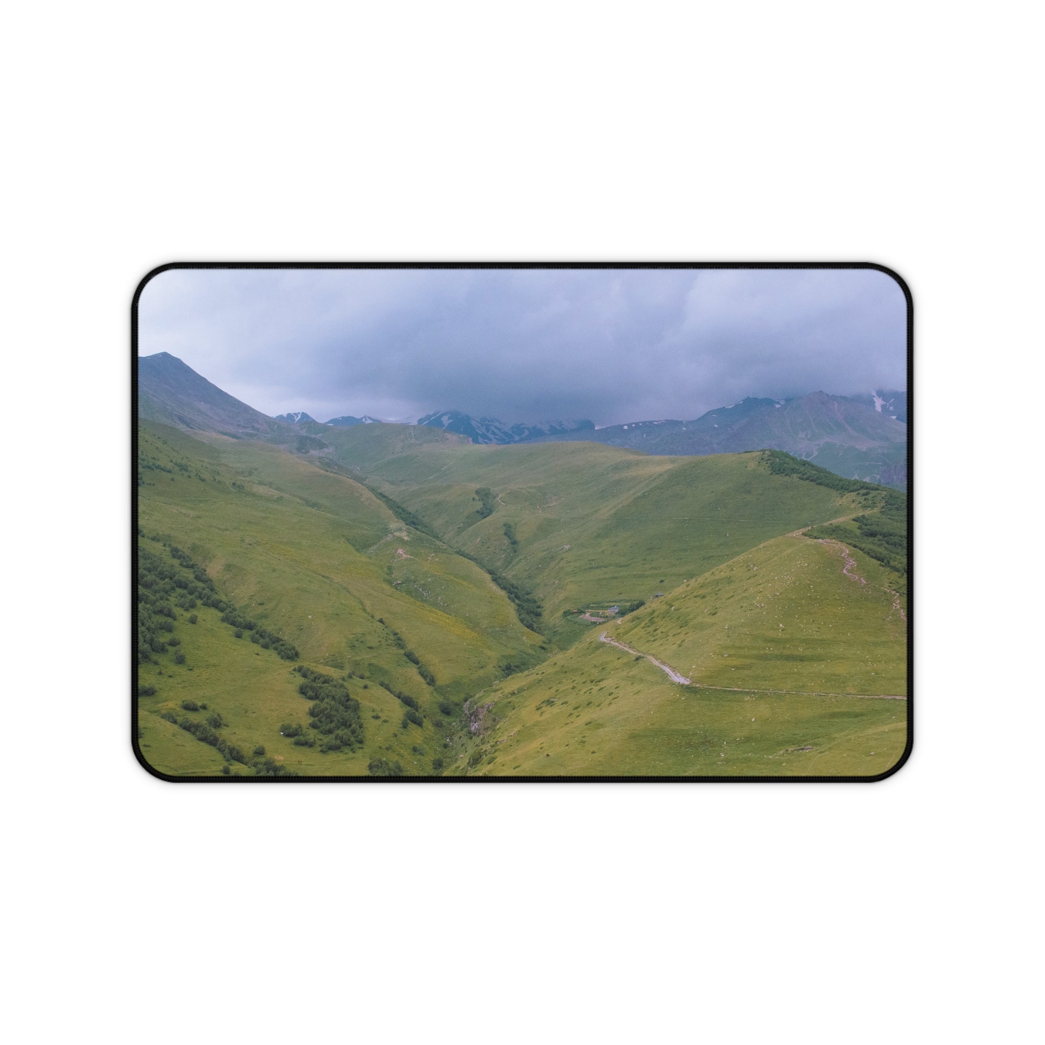 A Desk Mat featuring a design of a river running through a canyon, providing a serene and calming vibe to your workspace. Perfect for nature lovers and those seeking a touch of tranquility during work. Ideal for home offices, classrooms, and creative studios. Great for Earth Day, National Park Week, and World Environment Day.