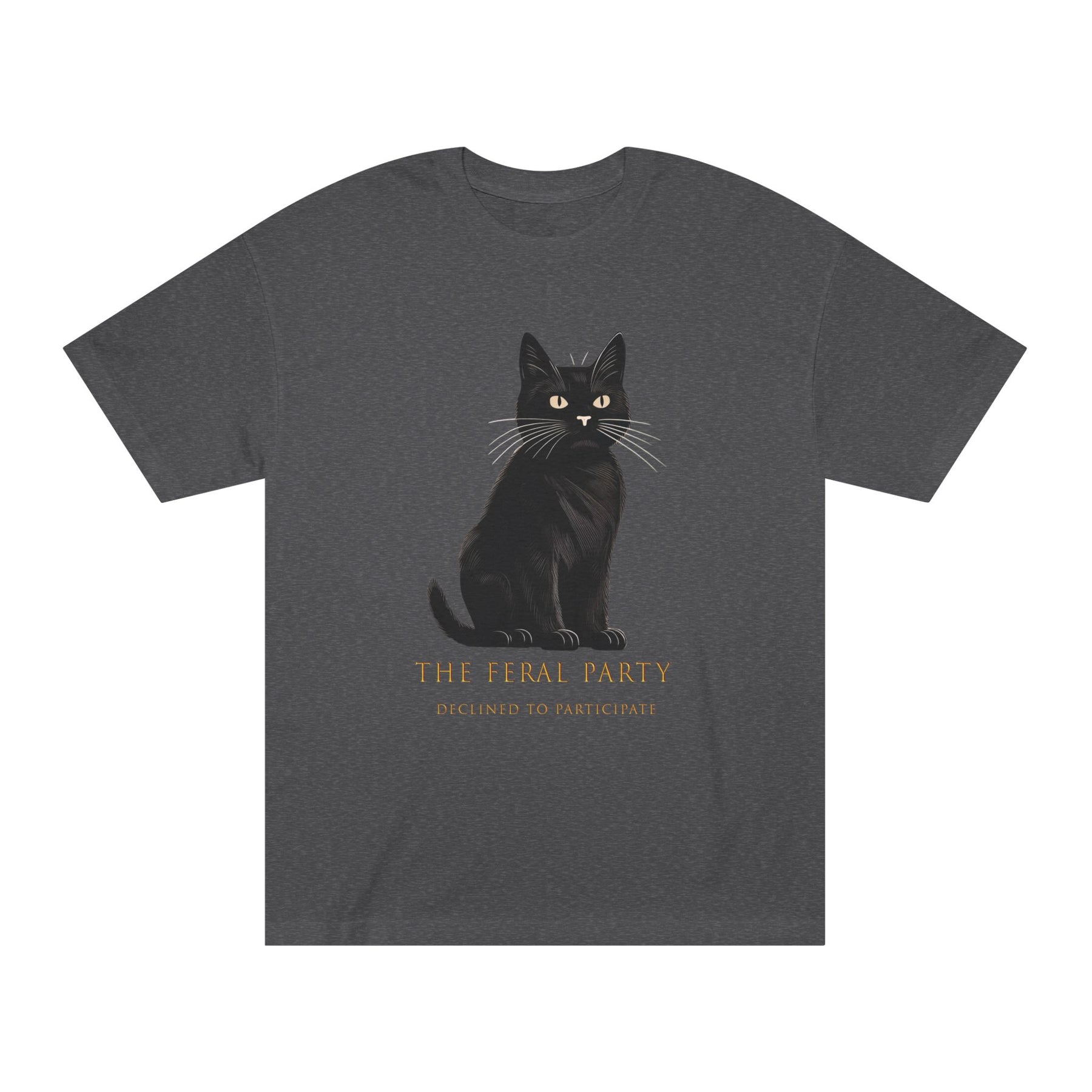 This minimalist unisex crew neck tee features an original black cat illustration and the phrase “The Feral Party — Declined to Participate.” It’s designed for people who choose observation over alignment and independence over affiliation.